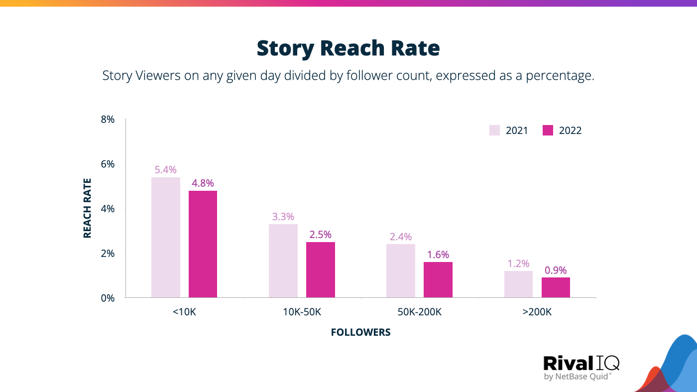Story reach rate declined across the board compared to 2021. For accounts under 10k, it was 4.8%, compared to 5.4% in 2021. For accounts of 10-50k, it was 2.5%, down from 3.3%. For accounts between 50k-200k it was 1.6%, down from 2.4% and for accounts over 200k it was 0.9%, down from 1.2%.