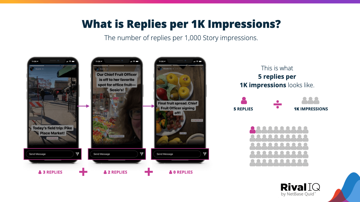 Most users don’t reply to Stories, so don’t worry too much about a low reply rate. The top 25% of brands have a reply rate of just 1.35% per 1,000 impressions – a minuscule number! The median number is just 0.48 replies per 1,000 impressions for goodness sake!