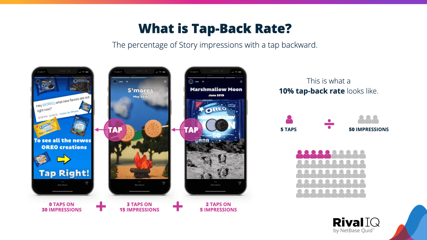 Tap back is when a viewer looks at a frame, moves forward, and then decides they want to go back and have a second look. The best brands (top 25%) see a tap-back rate of 7%, while the median tap-back rate is 4.8%. According to RivalIQ “taps back are a great indication of content that your followers want to consume more of.”